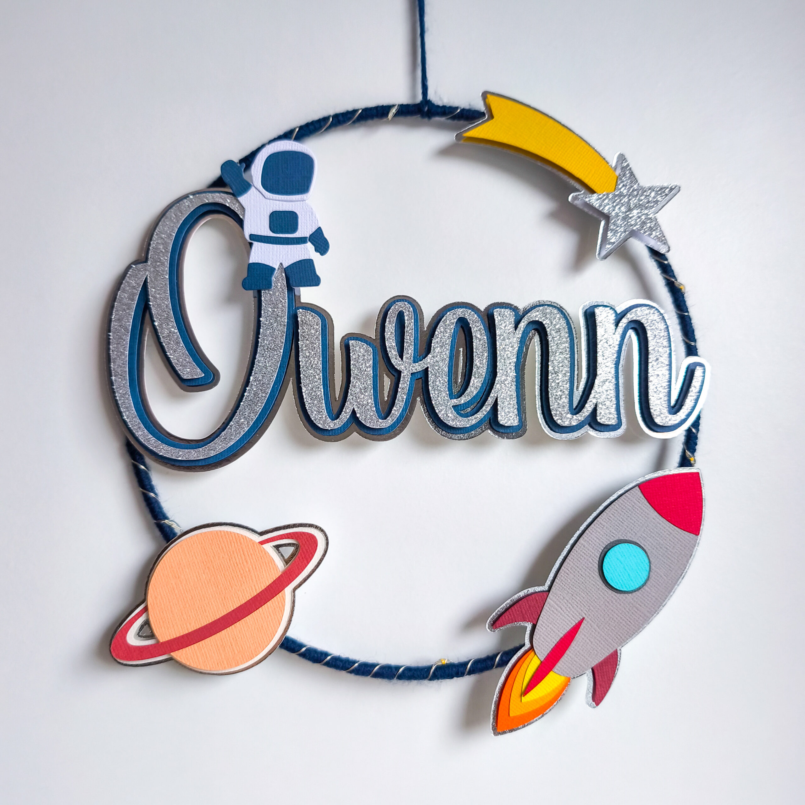 Couronne diamètre 20cm. Cercle en métal recouvert de fil bleu marine. Les éléments de décoration sont en papier.